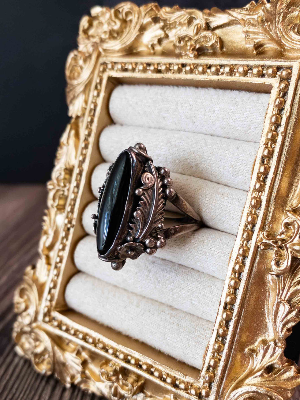 This vintage sterling silver ring by Zuni jeweler Raymond Gasper features an elongated oval black onyx that feels bold without being flashy. The deep black stone is framed by intricate floral details and silver beadwork, giving it that perfectly worn-in, collected-over-time feel that vintage jewelry does so well.
